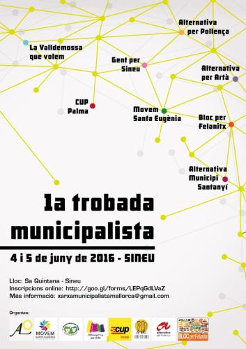El proper cap de setmana, 4 i 5 de juny, es durà a terme a Sineu la Trobada Municipalista, unes jornades de formació organitzades per Alternativa per Artà, Bloc per Felanitx, Alternativa per al Municipi de Santanyí, Movem Santa Eugènia, La Valldemossa que Volem, CUP-Palma, Alternativa per Pollença i Gent per Sineu.