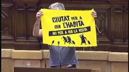 El diputat de la CUP al Parlament de Catalunya, Sergi Saladié, ha defensat al Parlament de Catalunya una sèrie de mesures que hauria d'implementar el Govern de la Generalitat i que podria servir de model per al Govern de les Illes Balears. El diputat ha exhibit durant la seva intervenció, una banderola amb el lema 'Ciutat per a qui l'habita, no per a qui la visita'.