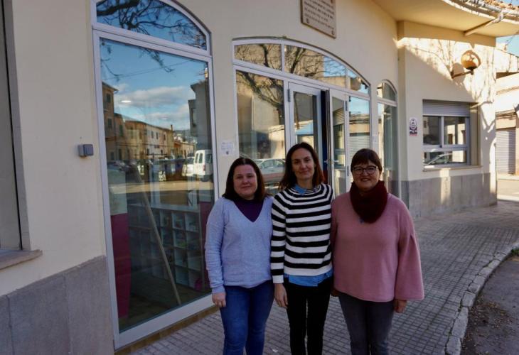 Bel Maria Martí, coordinadora de Fada Morgana; Maria Barceló, regidora d'Educació; i Magdalena Puig, coordinadora d'escoletes municipals. Darrere, la porxada exterior amb les millores ben visibles | Foto: Ajutament de Llucmajor