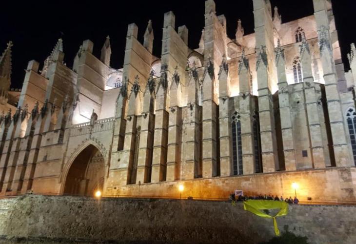 Un grup de persones solidàries amb els presos polítics independentistes, que durant els propers dies seran traslladats a presons espanyoles per ser jutjats a Madrid, han penjat un llaç groc gegant just al peu de la Seu de Palma.