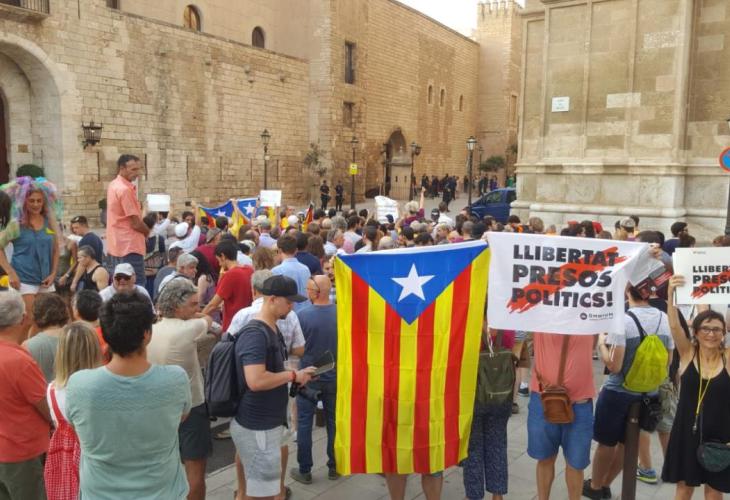 Convocats per la plataforma 'Arruix Borbons', que agrupa diversos col·lectius de defensa de la democràcia i la república, els republicans mallorquins han rebut Felip VI aquest dimecres al Palau de l'Almudaina de Palma amb una concentració de rebuig a la monarquia i a la presència dels reis espanyols a Mallorca.