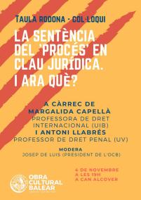 L'Obra Cultural Balear ha organitzat una taula rodona amb la professora de Dret Internacional de la UIB, Margalida Capellà i el professor de Dret Penal de la Universitat de València, Antoni Llabrés, sota el títol 'La sentència del Procés en clau jurídica. I ara què?'.