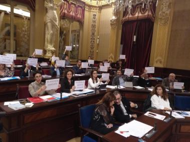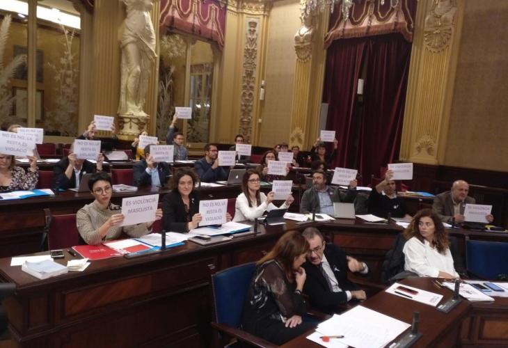 PSIB, MÉS i Unides Podem exhibeixen cartells contra la violència masclista durant la intervenció de Vox