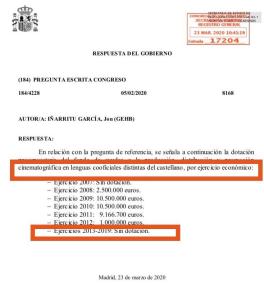 El diputat d'EH Bildu al Congrés, Jon Inarritu va fer una pregunta escrita al govern espanyol per conèixer quina quantitats de doblers es dedica a promoure la «cinematografia en llengües cooficials distintes al castellà». La resposta del govern espanyol, ha arribat aquest dimarts i és una llista detallada per exercicis anuals, en la qual es pot comprovar que el govern espanyol ha dedicat zero euros entre els anys 2013 i 2019 a la producció i difusió de la cinematografia en català, en gallec i en basc, tot i que la llei espanyola del cinema obliga el govern a dotar pressupostàriament aquesta partida.