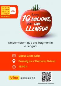 La Plataforma per la Llengua plantarà aquest dijous dia 23 de juliol, a les 18 h, al Passeig de l'Alamera de Vila, una tomàtiga de 3 metres de diàmetre per a difondre la campanya "Som 10 milions, som una llengua".