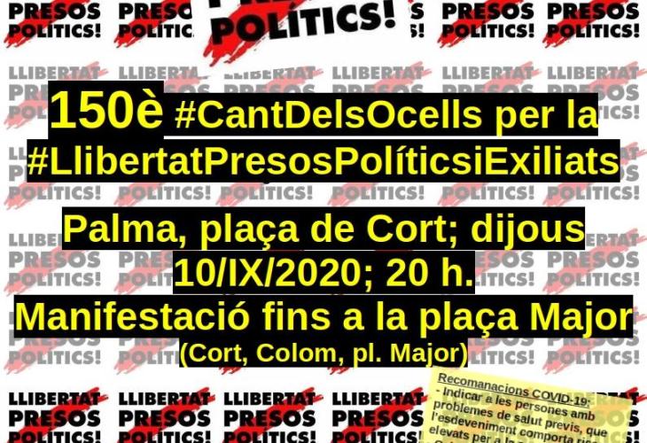 Aquest dijous, a les 20 hores, la plaça de Cort de Palma, acull, una vegada més, un grup de cantaires per complir amb el compromís, que ja arriba a la fita de noranta setmanes seguides, de cantar per la llibertat dels presos polítics.