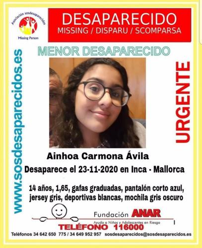 L'associació Sos Desaparecidos ha difós un avís per desaparició d'una menor, de 14 anys d'edat, que va ser vista per darrera vegada aquest dilluns 23 de novembre a Inca.