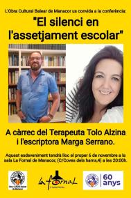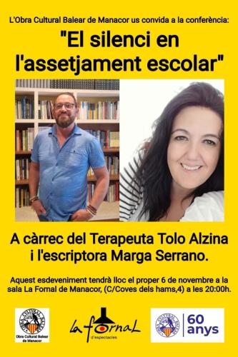 El proper dilluns, 6 de novembre, l'Obra Cultural Balear (OCB) de Manacor organitza la conferència 'El silenci en l'assetjament escolar'. La xerrada serà a càrrec del terapeuta Tolo Alzina i de l'escriptora Marga Serrano.
