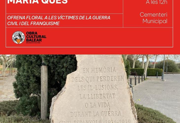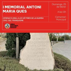 Amb motiu del 87è aniversari de la seva mort, des de la delegació d’Alcúdia de l’Obra Cultural Balear (OCB) han posat en marxa el I Memorial Antoni Maria Ques, per tal de retre homenatge a l’empresari republicà alcudienc en l’aniversari del seu assassinat, el 24 de febrer de 1937, al cementeri de Palma, junt a Antoni Mateu, Emili Darder i Alexandre Jaume.