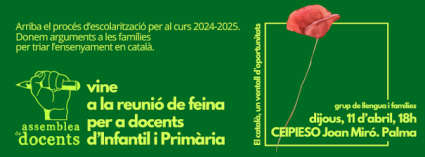 Quan és a punt de començar el període d'escolarització per al curs 2024-2025, per al qual es preveuen importants canvis al voltant de la llengua vehicular de l'ensenyament, l'Assemblea de Docents que considera que els canvis han estat «promoguts innecessàriament per la Conselleria d'Educació» i ha convocat els seus simpatitzants a una reunió per preparar la resposta.