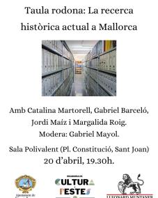 Catalina Martorell, Gabriel Barceló, Jordi Maíz i Margalida Roig formaran part de la taula rodona amb el nom 'La recerca històrica actual a Mallorca', moderada per Gabriel Mayol, a les 19.30 hores, d'aquest dissabte, 20 d'abril, a la Sala Polivalent de Sant Joan, a la plaça Constitució, organitzada per l'Ajuntament de Sant Joan i Lleonard Muntaner Editor.