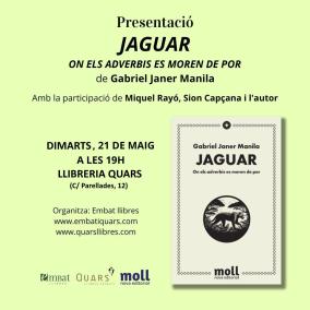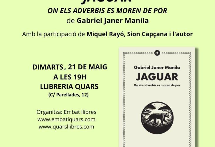 L’escriptor mallorquí Gabriel Janer Manila (Algaida, 1940) treu a la llum Jaguar. On els adverbis es moren de por, una prodigiosa història d’aventures, amarada de màgia i llegenda, que s’ambienta a la selva de l'Amazones, a la qual viatgen tres joves seguint la pista dels korubo i de la seva llengua, potser única en el món. La novel·la, publicada per Nova Editorial Moll, la presentaran el dimarts 21 a les set de l’horabaixa, a la llibreria Quars (Parellades 12, Palma) l’escriptor Miquel Rayó i el poeta i filòsof Sion Capçana, en companyia de l’autor.