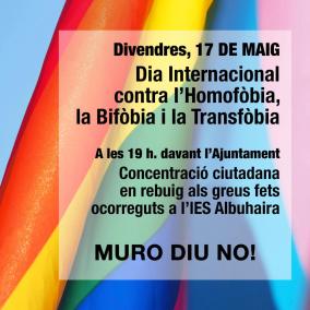 Aquest divendres, 17 de maig, Dia Internacional contra l'Homofòbia, la Bifòbia i la Transfòbia, s'ha convocat una concentració ciutadana a partir de les 19 hores davant l'Ajuntament de Muro per a expressar rebuig davant la crema de la bandera LGTBI a l'IES Albuhaira.