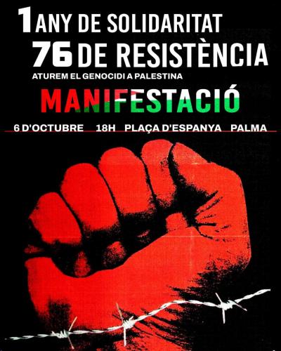 Mallorca per Palestina, Ciutadans per Palestina, Mallorca per la Pau i la CGT han convocat per a diumenge, 6 d'octubre, una manifestació unitària amb el lema '1 any de solidaritat, 76 anys de resistència: aturem el genocidi a Palestina'.