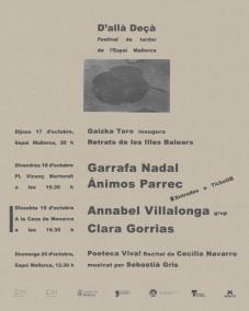 Garrafa Nadal, Ánimos Parrec, Annabel Villalonga grup i Clara Gorrias són els escollits per a tocar a la segona edició del D’Allà Deçà de l’Espai Mallorca i la Casa de Menorca de Barcelona. El festival, que se celebrarà a les dues seus des de dijous, 17 d'octubre, a diumenge, 20 d’octubre, és impulsat per l’associació sense ànim de lucre Crits i Renou per les Illes Balears.
