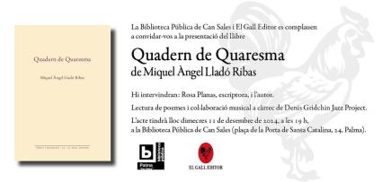 Aquest dimecres, dia 11 de desembre, a les 19 hores, tendrà lloc a la Biblioteca Pública de Can Sales (plaça de la Porta de Santa Catalina, 24, Palma) la presentació del llibre 'Quadern de Quaresma' de Miquel Àngel Lladó Ribas (El Gall Editor 2024). El llibre forma part de la col·lecció Trucs i Baldufes que El Gall Editor dedica a la poesia.