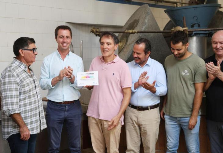 El president del Consell de Mallorca, Llorenç Galmés, ha lliurat el distintiu a Tomeu Deyà, propietari de la tafona històrica que manté viu el sistema tradicional de producció, en reconeixement al seu valor com a símbol del paisatge agrícola de la Serra de Tramuntana | Foto: Consell de Mallorca.