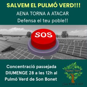 Des de la Plataforma Son Bonet Pulmó Verd denuncien que «AENA torna a impulsar i preveure el Mega Parc Fotovoltaic al Pulmó Verd de Son Bonet» i recorden que «aquest parc ha rebut un rebuig administratiu total per part de totes les institucions de les Illes Balears a diferents escales a més també del rebuig per part de Senat Espanyol en forma de moció» i que «també ha rebut l’oposició d’un dels movimenta veïnals més importants dels darrers anys, i gairebé sense precedents».
