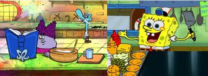 La segona sèrie d'animació que veurem avui, i que també gira entorn a la cuina, és Bob Esponja, que curiosament comparteix guionista amb l'anterior. Bob Esponja és el cuiner del "Crustáceo Cruijiente" on prepara exclusivament la seva única recepta: les Burguer Cangreburger (krabby Patty), elaborades amb pa, tomàtiga, cogombre, lletuga, algues, gelatina de grumer, carn i l' ingredient secret (molt d'amor); que episodi a episodi tracta de descobrir l'arxienemic Plankton... de forma infructuosa, cal a dir.