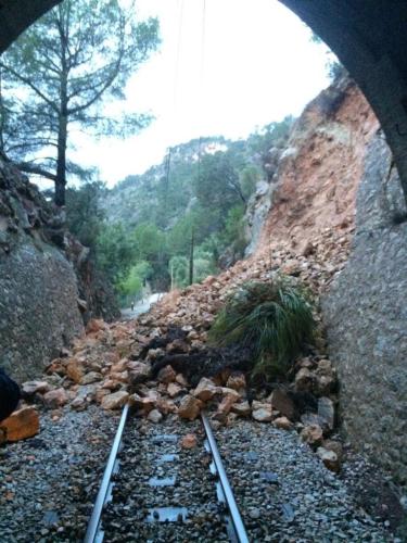 A causa del temporal de pluja que afecta tota l'Illa des del passat dijous aquest dilluns s'ha produït un despreniment de terra i pedres que han caigut sobre les vies del tren, a l'altura del Pujol d'En Banya.