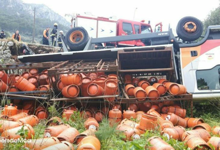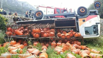Un camió carregat de bombones de butà plenes ha bolcat en el matí d'aquest dilluns a l'aparcament d'un restaurant situat a la carretra del Desviament, devora la benzinera. L'accident ha tengut lloc després de cedir part d'un mur de pedra. Els dos ocupants del vehicle han resultat il·lesos.