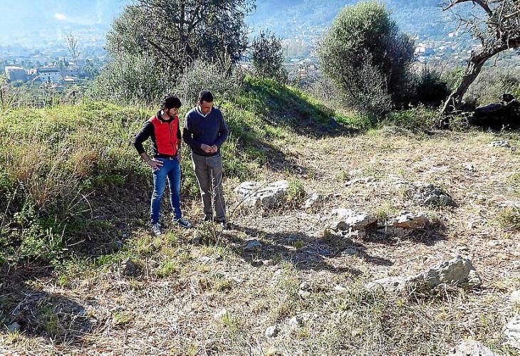 SOLLER. APTRIMONIO. Los arqueólogos delimitarán las estructuras que aún existen en el yacimiento del Puig d’en Canals . Jaume Deyá muestra unos restos al alcalde Servera | Foto: Ll.G.