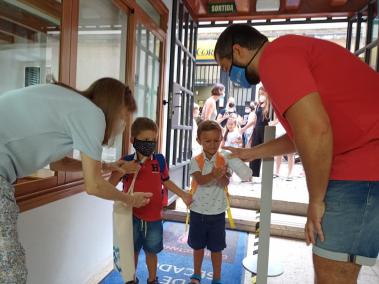 Dos alumnes del mateix grup bimbolla entren al col·legi Sant Vicenç de Paül | Foto: I. Cabrer