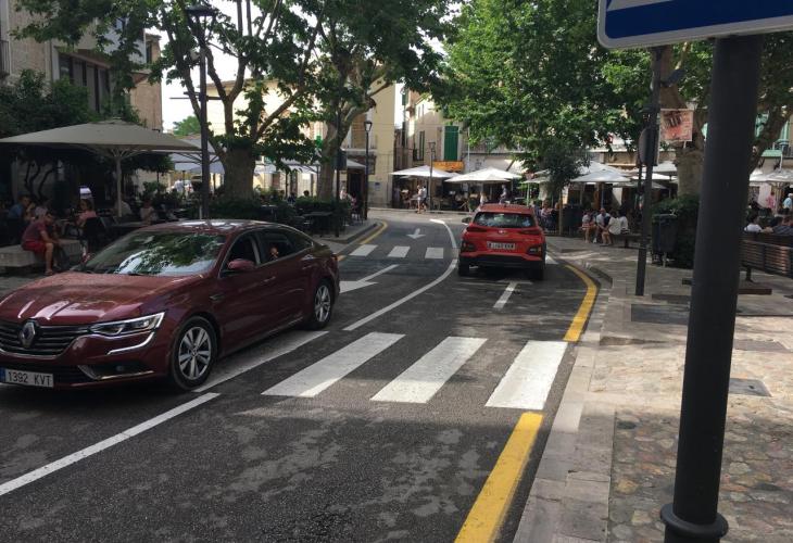 SOLLER. CIRCULACION. La reforma circulatoria del PP lleva más tráfico a la plaza. Señalización. Algunos vecinos comentan que el texto sobre el asfalto con letras de gran tamaño ¿«Stop al tren», a la derecha¿ es de dimensiones exageradas. Sobre estas líneas, un momento de la circulación en la plaza, en dos direcciones, después de cuatro años de un solo carril | Foto: Ll.G.