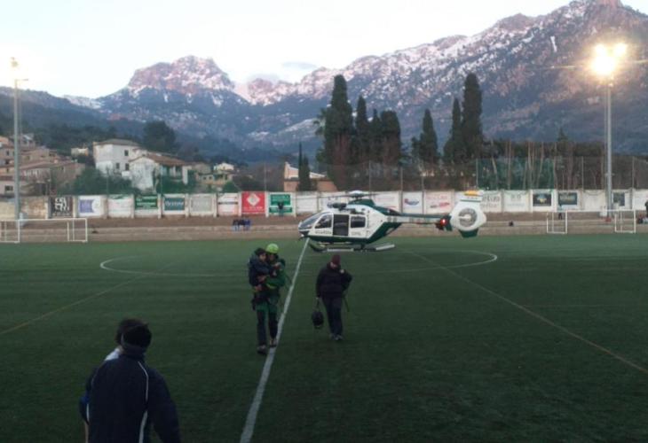 Un helicòpter aterra al camp de futbol amb tres rescatats a la muntanya