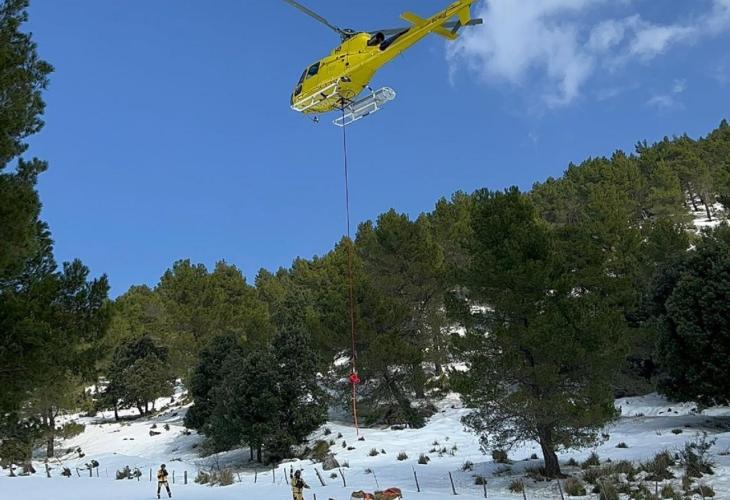 Un helicòpter va apropar a la finca Bini Gran sacs amb menjar pels animals, que feia dies que no menjaven per la neu